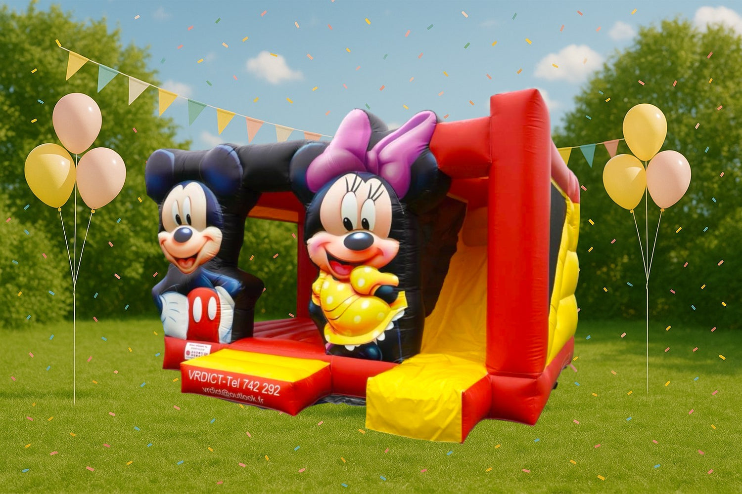 Anniversaires, baptĂȘmes, fĂȘtes familiales, kermesses, comitĂ©s d'entreprises⊠Ce chĂąteau Mickey et Minnie ajoute une touche magique et originale Ă toutes vos occasions !